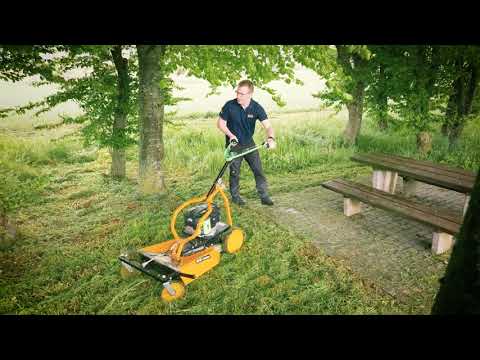 Das Kreuzmessersystem schneidet und zerkleinert zuverlässig das Schnittgut bei Schnitthöhen von 50-100 mm. Diese werden achsweise eingestellt, vorne stufenlos und hinten in fünf Stufen. Das geschlossene Mulchmähdeck mit Heckauswurf verhindert ungewolltes Auswerfen von Schnittgut zur Seite. Die Fahrgeschwindigkeit kann stufenlos während der Fahrt von 1,9 und 4 km/h variiert werden. Die 30 cm großen Antriebsräder sorgen für gute Traktion. Für Arbeit in leichten Hanglagen lassen sich die Vorderräder arretieren, um ein Abtriften der Maschine zu verhindern.