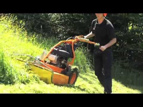 Nur drei Hebel reichen zur Bedienung der Maschine aus: Messerkupplung links, Parkbremse und Fahrantrieb rechts sowie Entsperrung der Differenzialsperre links. Die Bedienung ist besonders einfach und intuitiv möglich. Beim Loslassen des Fahrhebels springt sofort die automatische Parkbremse ein und stoppt die Maschine sicher am Hang. Nur bei Bedarf, zum Beispiel beim Wenden oder bei der Kurvenfahrt, wird die permanente Differenzialsperre kurz per Bedienhebel entsperrt – natürlich ohne anzuhalten während der Fahrt. Der Holm des AS 73 4T B&S ist zur Seite und in der Höhe einstellbar. Die Schnitthöheneinstellung erfolgt stufenlos im Bereich von 50 – 100 mm über das Vorderrad.