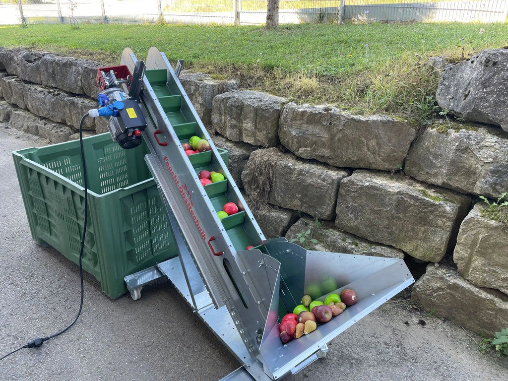 Du möchtest deine Apfelernte noch effizienter und rückenschonender gestalten? Dann ist das 1,7 m lange Förderband von Feucht Obsttechnik genau das Richtige für dich. Es transportiert deine Äpfel zuverlässig und schonend vom Rollblitz direkt in die Großkiste oder auf den Anhänger – ohne schweres Heben oder Bücken. Mit seinen hohen Förderlamellen sorgt es dabei für einen sicheren Transport auch bei größeren Mengen und unebenem Gelände.
