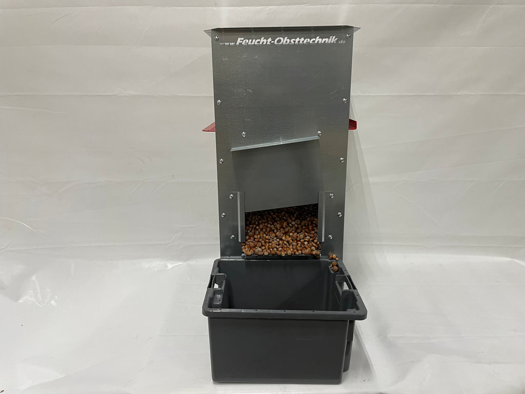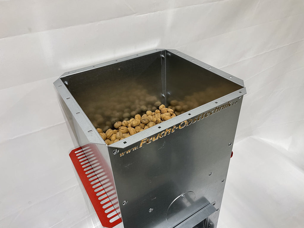 Der Heizlüfter wird direkt an das Trocknungslager angeschlossen. Durch eine Klappe kann die Feuchtigkeit der Nüsse während des ganzen Prozesses kontrolliert werden. Dadurch kann mit dem Trockner Mini ein sehr gutes Trocknungsergebnis erzielt werden.