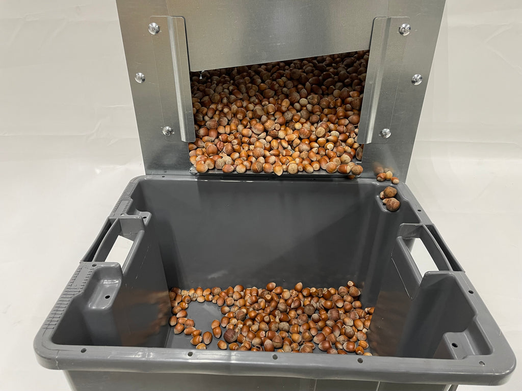 Die trockenen Nüsse werden dann durch einen großen Auslass entleert. Der Trockner Mini verfügt über 2 Etagen. Die Kapazität des Trocknungslagers kann mit einer Erweiterung (enthält 2 Ebenen) erhöht werden.
