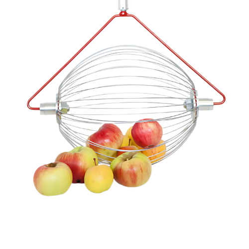 Zum Entleeren schiebt man den Drahtkorb so auf den Bügel, dass die Korbdrähte zum Bügel im rechten Winkel stehen. Dadurch werden die Drähte schonend gespreizt. Den Rollblitz gibt es in 3 Größen, je nach aufzulesendem Obst.