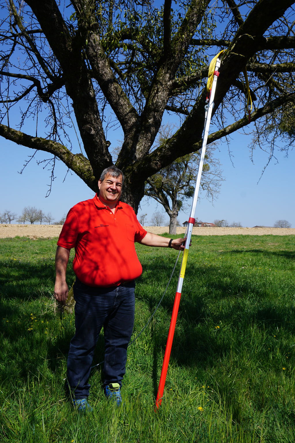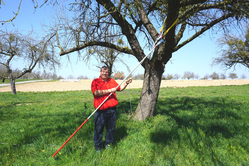 Mit dem Teleskopstab können Sie 50 % Zeit beim Anbringen des Obstbandes einsparen.Das patentierte Werkzeug für die Befestigung des Obstschüttelbandes ohne Leiter.
