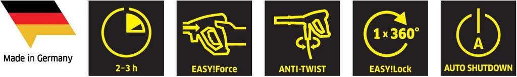 Kärcher setzt auf kraft- und zeitsparende Lösungen, die den Arbeitsalltag deutlich erleichtern. Die EASY!Force-Hochdruckpistole ermöglicht ermüdungsfreies Arbeiten ohne Haltekräfte, während die robusten EASY!Lock-Schnellverschlüsse Verbindungen bis zu fünfmal schneller herstellen als herkömmliche Schraubsysteme. Das spart Zeit, erhöht den Komfort und sorgt für einen reibungslosen Ablauf. |