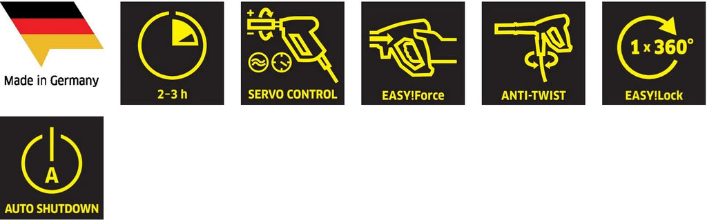 Kärcher setzt auf kraft- und zeitsparende Lösungen, die den Arbeitsalltag deutlich erleichtern. Die EASY!Force-Hochdruckpistole ermöglicht ermüdungsfreies Arbeiten ohne Haltekräfte, während die robusten EASY!Lock-Schnellverschlüsse Verbindungen bis zu fünfmal schneller herstellen als herkömmliche Schraubsysteme. Das spart Zeit, erhöht den Komfort und sorgt für einen reibungslosen Ablauf. |