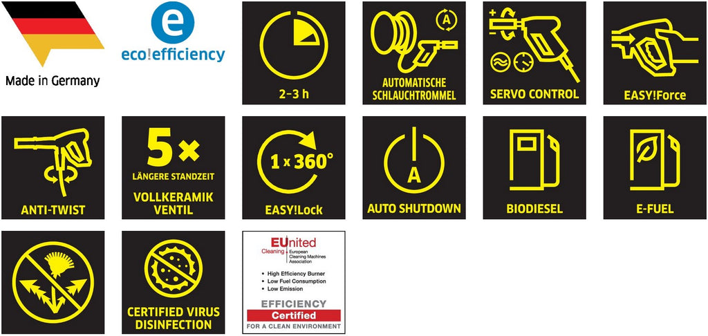 Betriebssicherheit Der Kärcher bietet höchste Betriebssicherheit durch durchdachte Schutz- und Überwachungssysteme. Ein leicht zugänglicher Wasserfilter schützt die Pumpe zuverlässig vor Schmutzpartikeln, während Sicherheitsventile sowie Wasser- und Brennstoffsicherung eine dauerhaft hohe Geräteverfügbarkeit gewährleisten. Das integrierte Softdämpfungssystem (SDS) reduziert zudem Schwingungen und Druckspitzen im Hochdrucksystem welches für einen ruhigen, langlebigen und störungsfreien Betrieb sorgt. |
