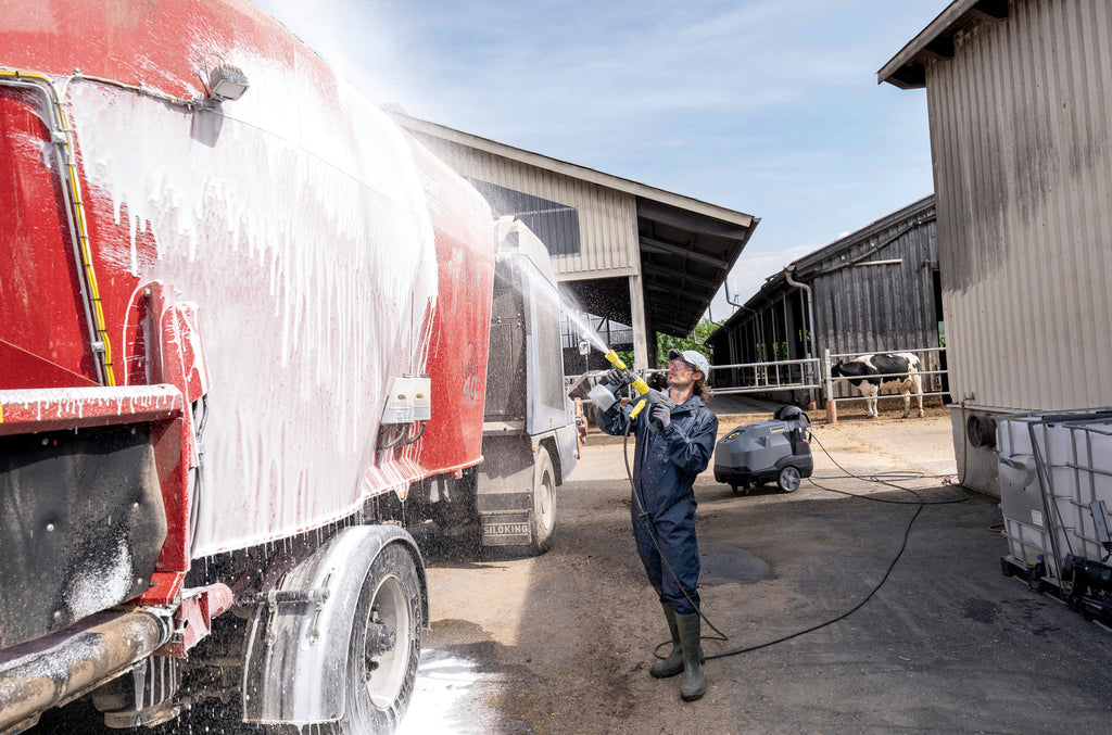 Sehr anwenderfreundlicher Heißwasser-Hochdruckreiniger der Mittelklasse mit robuster 3-Kolben-Axialpumpe, wassergekühltem 4-poligem Elektromotor und 2 Reinigungsmitteltanks.