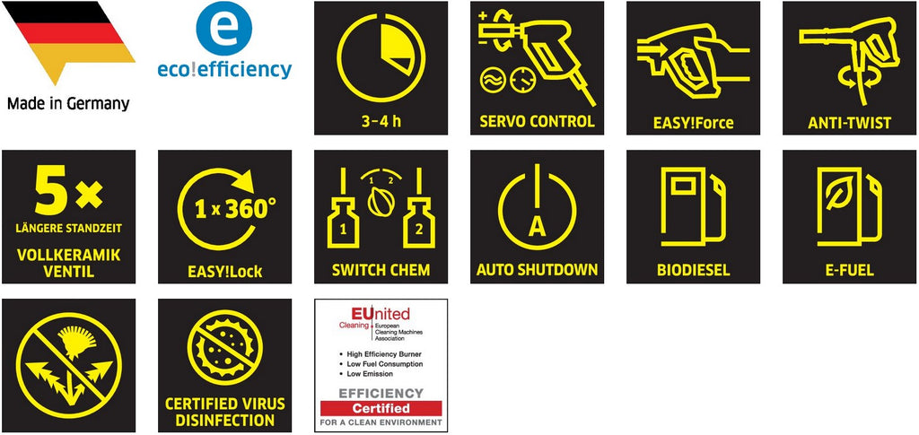 Der Kärcher überzeugt durch höchste Effizienz dank bewährter Brennertechnologie „made in Germany“. Der kraftvolle 4-polige Elektromotor mit 3-Kolben-Axialpumpe sorgt für konstant hohe Leistung, während die Wasserkühlung des Motors eine optimale Betriebstemperatur gewährleistet und die Lebensdauer des Geräts deutlich verlängert. So wird maximale Reinigungsleistung mit langlebiger Technik kombiniert. |