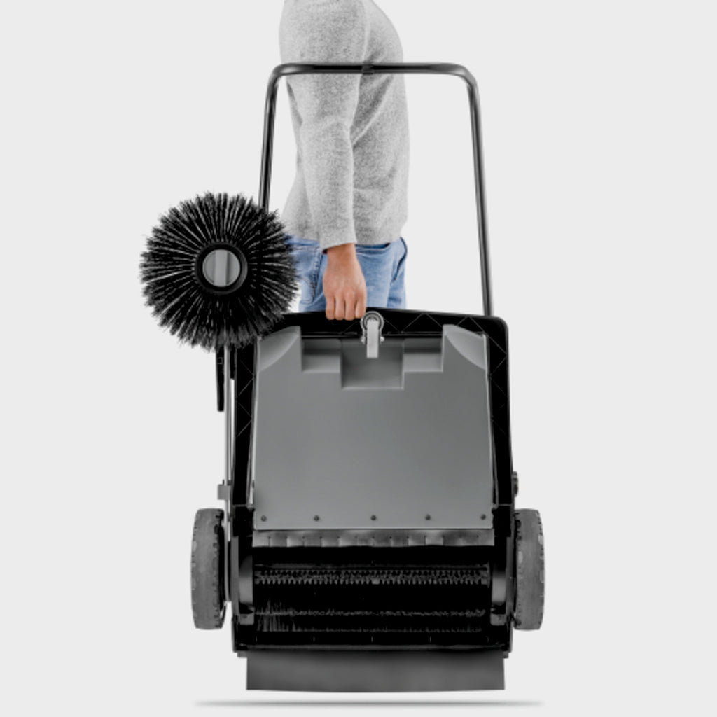 Mit der kompakten Handkehrmaschine KM 70/15 C Classic lassen sich alle Flächen im Innen- und Außenbereich einfach und bequem säubern. Ab einer Fläche von 100 Quadratmetern ist sie wesentlich effizienter als ein Besen. Durch das niedrige Eigengewicht und den geringen Rollwiderstand der Räder ist sie leicht zu manövrieren und zu transportieren. Der Antrieb der Kehrwalze erfolgt über das linke Rad und sorgt so für einen zuverlässigen Transport des Kehrguts in den Kehrbehälter. Ränder und Ecken werden mit dem Seitenbesen gekehrt. Zur Reduzierung unerwünschter Staubentwicklung kann er auf der Fläche hochgeklappt werden. Der Seitenbesen ist einstellbar, um Verschleiß auszugleichen. Für den Wechsel werden keine Werkzeuge benötigt. Der Kehrgutbehälter lässt sich im Handumdrehen entnehmen und entleeren. Seine Frontseite ist so geformt, dass dieser frei darauf abgestellt werden kann. Der klappbare Schubbügel kann an die Körpergröße des Bedieners angepasst und zum platzsparenden Verstauen der KM 70/15 C Classic vollständig umgeklappt werden.