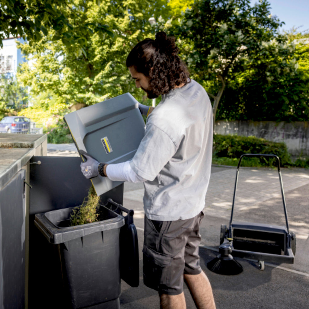 Der große Schmutzbehälter lässt sich dank ergonomischem Griff besonders leicht handhaben und entleeren. Zudem ist der Kehrgutbehälter selbststehend, was das Abstellen und Auskippen noch komfortabler macht. |