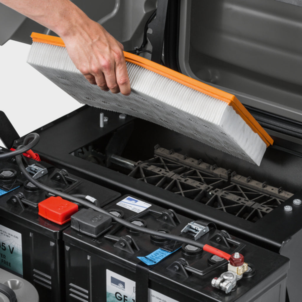 Das leistungsfähige Filtersystem sorgt für eine zuverlässige Staubabscheidung auch bei intensiven Einsätzen. Ein robuster Flachfaltenfilter aus Polyester wird durch Dual-Abstreifer effektiv abgereinigt, bequem vom Bedienerplatz aus. Der Filter ist über eine weit öffnende Gerätehaube werkzeuglos zugänglich, was Wartung und Service besonders einfach macht. |