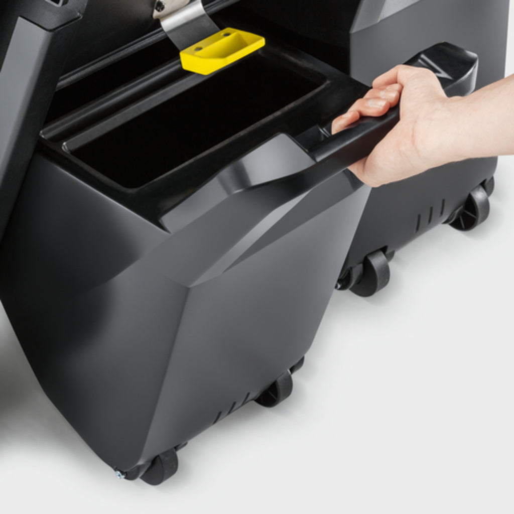 Das clevere Behälterkonzept erleichtert die Entnahme und Entleerung des Kehrguts deutlich. Zwei separate Kehrgutbehälter sorgen für eine sichere Handhabung, während kantenfreie Ausführungen eine rückstandsfreie Entleerung ermöglichen. Integrierte Rollen an den Behältern erleichtern zusätzlich den Transport und machen das Entleeren besonders komfortabel. |