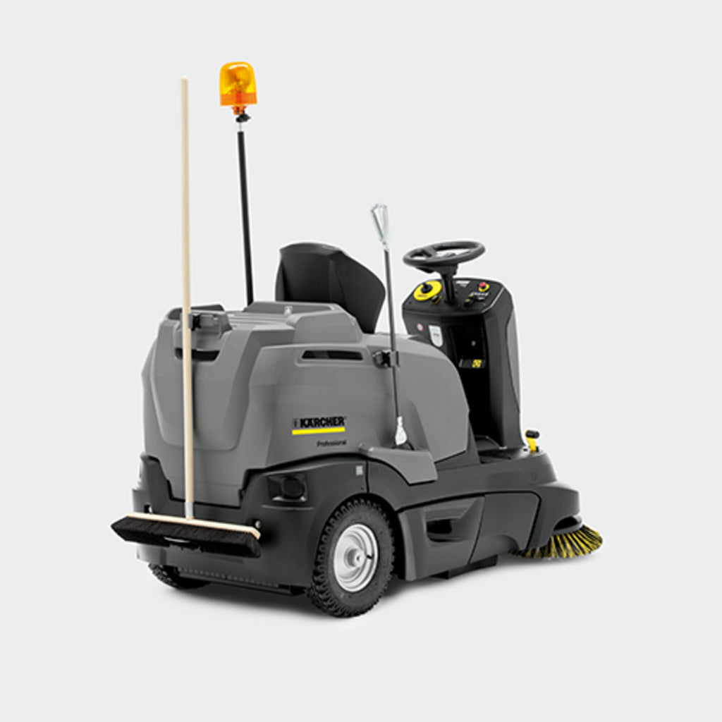 Unsere batteriebetriebene Aufsitz-Kehrsaugmaschine KM 90/60 R Bp Pack mit ausweichendem Seitenbesen begeistert mit ihrem agilen Fahrverhalten und hoher Wendigkeit bei emissionsfreien Reinigungseinsätzen in Innen- und Außenbereichen, wie in Parkhäusern, Logistikzentren oder Produktionshallen. Ausdauernde 180-Ah-Batterien, die komfortabel on-board geladen werden, gewährleisten dabei lange Arbeitseinsätze. Dazu ist die KM 90/60 R Bp Pack dank EASY-Operation-System kinderleicht zu bedienen und verfügt über eine praktische Pick-up-Fläche sowie den Anbausatz Home-Base, sodass auch die Mitnahme weiterer Reinigungsutensilien problemlos möglich ist. Das einzigartige, automatische und höchst effektive Rundfilter-Abreinigungssystem ermöglicht staubfreies Arbeiten ohne Saugkraftverluste.