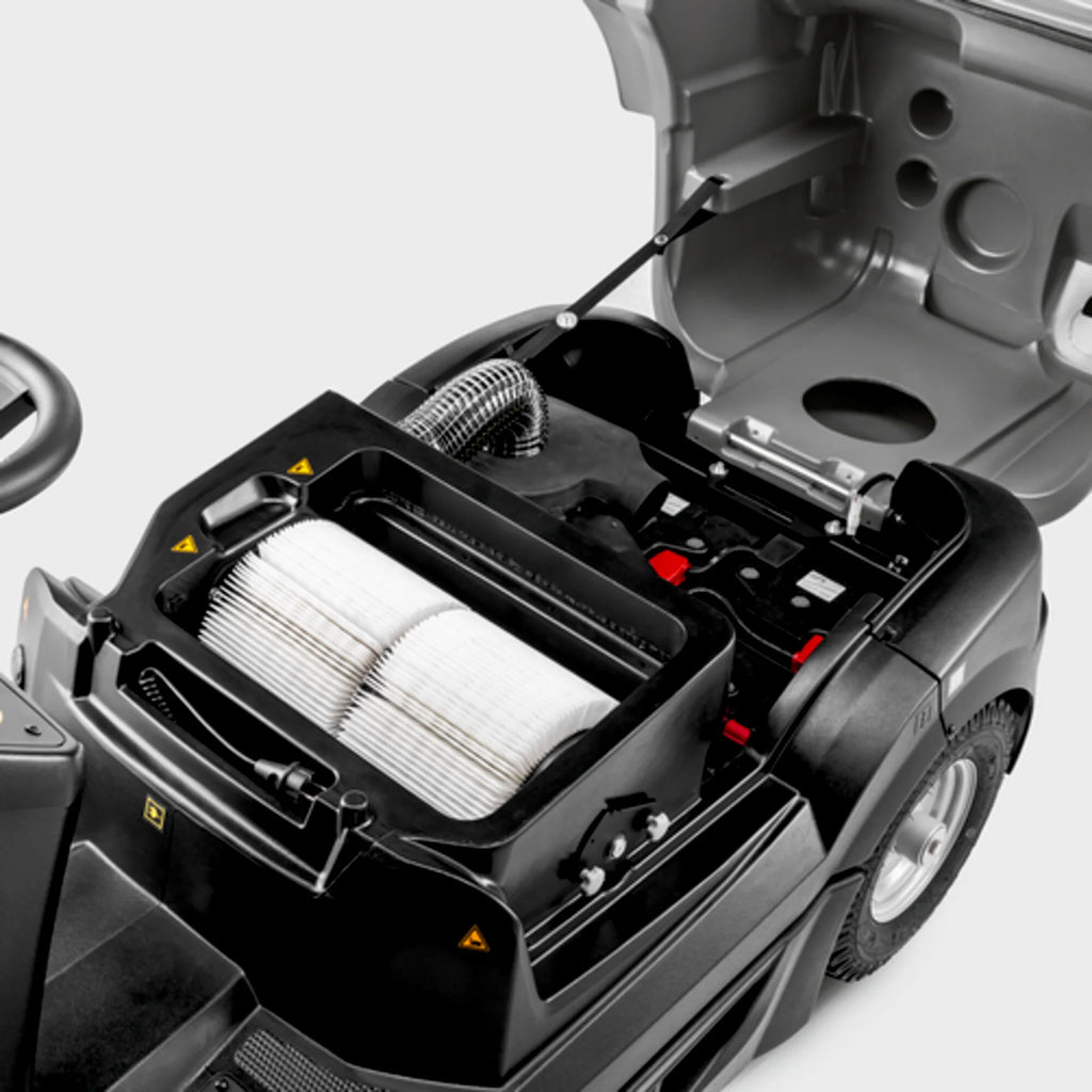 Die große Filterfläche mit automatischer Abreinigung sorgt für dauerhaft staubarmes Kehren und lange Arbeitsintervalle. Nach jedem Abstellen der Maschine wird der Filter automatisch gereinigt, bei Bedarf kann die Abreinigung auch manuell aktiviert werden. Der Filter lässt sich zudem werkzeuglos wechseln, was Wartung und Service besonders einfach macht. |
