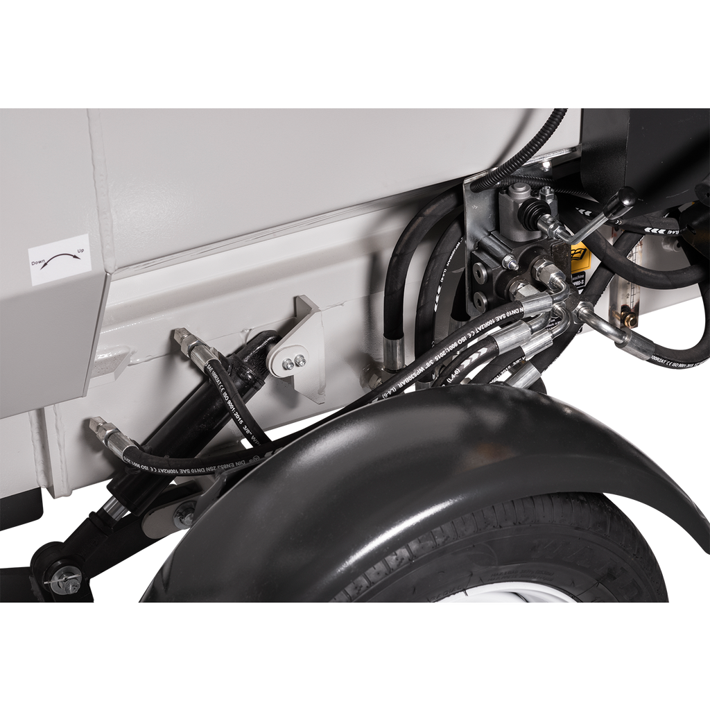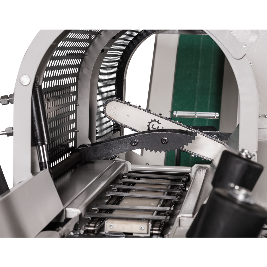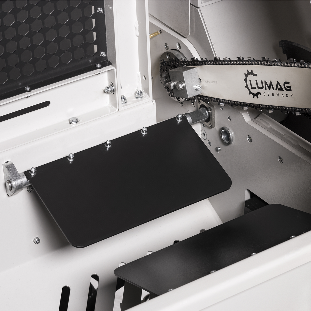 Die Bedienung der Maschine ist vollständig hydraulisch gestaltet: Du steuerst sowohl die Kettensäge als auch den Stammhalter präzise und leichtgängig, während du das Spaltkreuz hydraulisch an verschiedene Holzgrößen anpassen kannst. Das neue, breite, integrierte hydraulische Zuförderband bringt das Holz automatisch zur Sägespalteinheit, wodurch dein Arbeitsfluss deutlich effizienter wird. Zwei neue mechanische Klappen verhindern zudem, dass sich das gesägte Material vor dem Spalten verkantet – du kannst ungestört und kontinuierlich arbeiten.