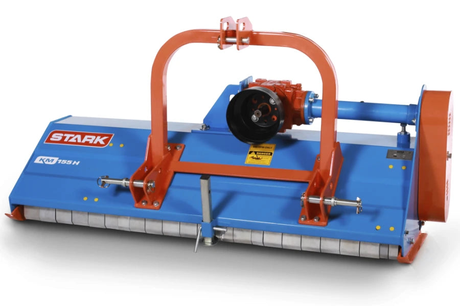 Der Stark Mulcher KM 155 H ist als mittelschweres Mulchgerät konsequent auf Langlebigkeit und Leistung ausgelegt. Der besonders stabile Dreipunktanbau und der 5 mm starke Rahmen halten auch bei härterem Einsatz zuverlässig stand. Angetrieben wird der Mulcher über eine 540 U/min Zapfwelle mit Freilaufgetriebe und einem robusten Riemenantrieb mit drei Keilriemen.