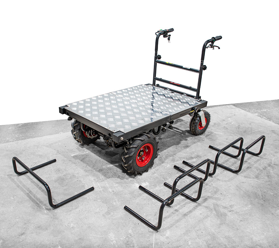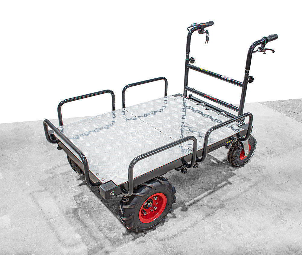 Besonders praktisch ist die flexibel einstellbare Ladeplattform. Sie lässt sich in der Länge von 111 bis 132 cm anpassen und ermöglicht zusammen mit den seitlichen Halterungen den sicheren Transport unterschiedlichster Materialien. Die leistungsstarke 24-Volt-Batterie sorgt je nach Auslastung für eine Betriebszeit von bis zu sieben Stunden und lässt sich über das Schnellladesystem in etwa acht Stunden wieder vollständig aufladen.